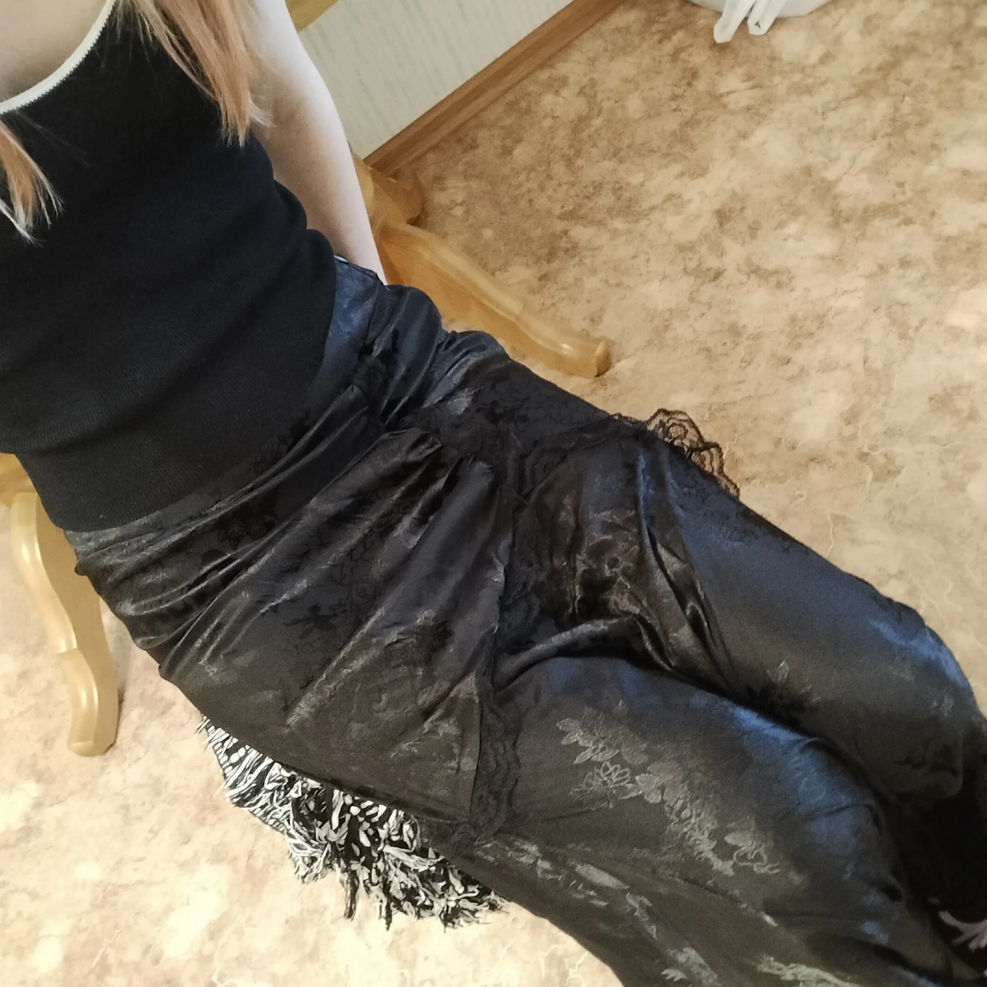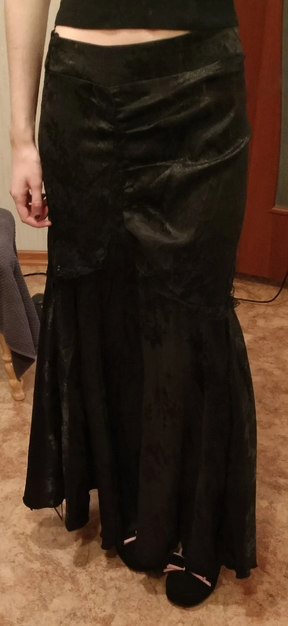 This is the first time I've encountered that a product from China is too big for me. I took my size: S. Measurements: waist 64, hips 90. Height 170. The skirt is made of very poor material... it gets electrified and sticks to the legs, it looks just awful. If my hips were even wider, by the way, it would tear because the fabric doesn't stretch. Someone said in the reviews that the skirt is light and not suitable for summer. you will sweat in it and it does not blow through. I don't know at all what kind of weather to wear it in. In the product photo, the material looked denser, and also, for some reason, the first photo was reflected, and I thought they sent me a defective item altogether. Also, this fabric is very unpleasant (personally for me it's a minus) as it reflects any light, as seen in the last photo. I have an association with a swimsuit. 😭 . The only plus is free and fast delivery, that's really cool.